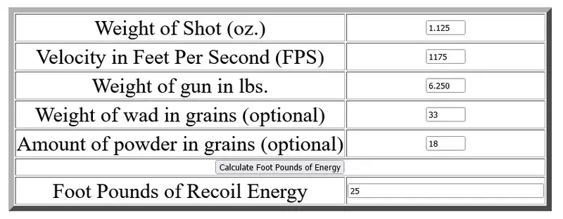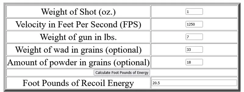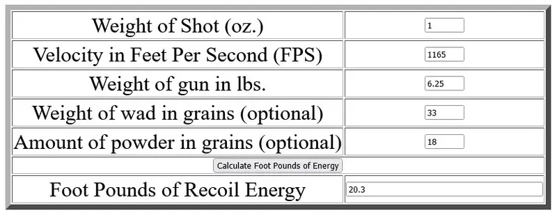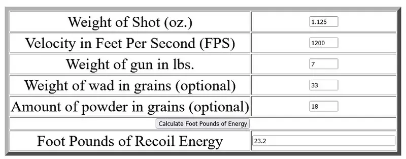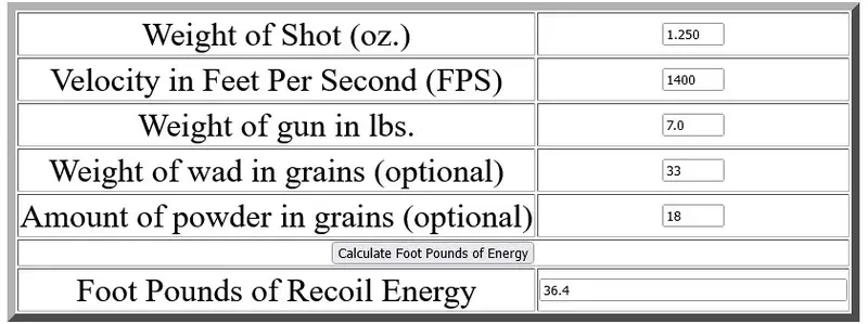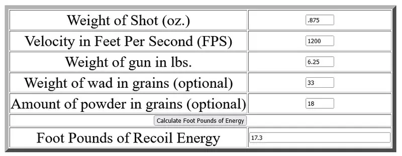 oz. 12 gauge pheasant load from a 7 lb. gun develops 36.4 fpe: