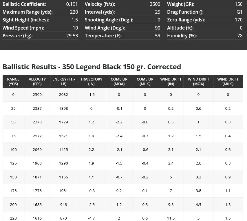 The most accurate round of the several 350 Legend examples I tested last year was the 170 grain Hornady American Whitetail Round. In my Savage 110 anyway, the Hornady Black round appears to be just as accurate, but takes the trajectory up a clear notch with less drop, wind drift, and a higher strike velocity as well.