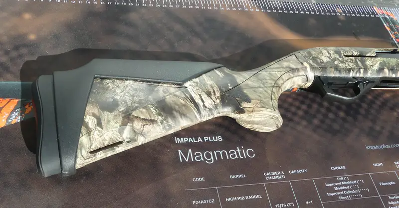 inch barrel and a horrific screw-on plastic comb riser. I could scarcely contain my contempt for the miserable cheap plastic comb riser, which renders the shotgun useless as supplied for shooting flying targets: it does not fit humans. Sadly, all recently imported synthetic Impala Plus shotguns were shipped with the nasty comb riser, a huge mistake. The importer for Impala Plus is KFI Firearms: https://kfifirearms.com/ . The KFI website is still a work in progress, full of typos and incoherent information. Impala Plus shotguns now have a five year written warranty, up from just two. This nasty comb riser can be removed. You remove three screws, insert a plastic spacer into the butt stock, and reinstall the recoil pad. You are left with an unsightly, nasty gap between the recoil pad and the buttstock. An O-Ring is supplied that you slip over the recoil pad to fill the gap, but it does not completely do so and looks both slipshod and amateurish. The walnut model has an O ring as well, but the end result is much more pleasing. After you get rid of the truly stupid comb riser, you are left with a hole on top of the buttstock. It makes the gun appear unfinished, for that is what it is. I called around hoping to find a normal MOBUC buttstock, but with no luck. Yes, I'm disgusted. Apparently, the reason for the comb / cheek riser was for use only with a cantilevered slug barrel model, not available in the United States. If you are getting the idea that I have great disdain for the comb / cheek riser dirty trick, it is only because I do.