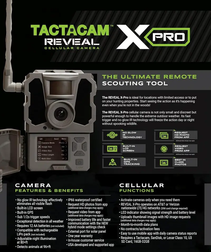clear winner.The Reveal X Pro also has a faster trigger. After the initial comparison of these cameras, I decided to buy a third Tactacam: another Reveal X Pro, of course. This one came in with two SIM cards, but the Verizon card was not recognized. A call to Tactacam customer service and it was quickly manually added. My understanding is that the glow-type LED flash found on the Reveal X Gen 2.0 is supposed to have a greater range compared to the black or 'no-glow' LED array on the Reveal X Pro. The difference, to my eyes, is not greatly significant. Supposedly, the Reveal X Gen 2.0 has a greater battery life, but based on running these three cameras at the same time, that is not readily apparent. Supposedly, you can get 4000 pictures or so with lithium batteries. Loose, disposable batteries are too expensive and clumsy for my tastes. That's why I bought a total of five rechargeable lithium packs: https://amzn.to/3QCILFl . I also picked up a total of six of these SD cards: https://amzn.to/4bpyJ2j . When needed, I can swap battery packs and SD cards in moments.