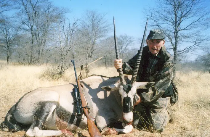 Above: Dad, Randy, and perhaps the world's best professional hunter, Karel Haefele of KeMonati Safaris. Over the years, when not hunting with a muzzleloader, I've used the .270 to take more game than any other cartridge. That includes not just lighter animals like pronghorn, blesbok, and caribou, but also red hartebeest, moose, and blue wildebeest. The blue wildebeest, more correctly the brindled gnu or black-tailed gnu, can hit eight feet in length head to rump, up to 4.8 feet tall at the shoulder, weighing up to the 640 pound or so area. While it may look like a crazed, strange, maverick cow, it is an antelope. The sub-family Alcelaphinae is a group of large, nomadic antelope native to Africa: the brindled gnu is related to red hartebeest and the blesbok that are also from the Alcelaphinae sub-family. They may look clumsy, yet they have been clocked at over 50 miles per hour. For those who doubt the effectiveness of the .270 Winchester with a 130 grain Hornady Interbond on the "poor man's water buffalo," the blue wildebeest, take a look.