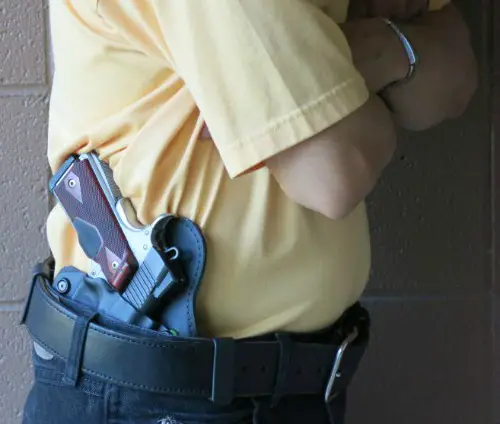 Alien Gear Cloak Tuck 2.0 IWB Holster - A Second Opinion By David Tong ![]() The majority of the legal concealed carry license holders carry their handguns in a holster. This may be behind the strong-side hip, forward in the appendix position, cross-draw, somewhere inside the waistband (IWB), or in a shoulder rig. Mostly, the position that works best and is most comfortable depends on the physique of the wearer and the size (mostly thickness and butt length) and weight of the handgun to be carried. At the request of Alien Gear's Ibro Palic, G&S Online Owner/Managing Editor Chuck Hawks recently reviewed the Alien Gear Cloak Tuck 2.0 IWB and Cloak Slide OWB Holsters, which are made in Hayden, Idaho. Before beginning the review, Chuck warned Ibro that he generally finds carrying any concealed handgun uncomfortable in an IWB holster, no matter how well designed the holster may be. He says the reason is his waist is larger than it was when he was in college and that makes wearing an inside-waistband holster, even for a sub-compact Ruger LC9s pistol, uncomfortable. I agree that, for certain body types, inside waistband carry can be uncomfortable, depending on the position and the size of the pistol. I am a pretty slender guy. I have long carried concealed a full-sized, steel, 1911 pistol weighing nearly three pounds and I have never considered it much of a burden. As a matter of fact, I have always thought of it as comforting. I have gained maybe 15 pounds over the past twenty years, which for me is a lot. With the relatively recent introduction of so many interesting pistols, I have wondered whether a full-sized, steel pistol could be more comfortably carried. Alien Gear (www.aliengearholsters.com) makes a 100% synthetic holster consisting of a nylon/neoprene base, with a molded Kydex plastic holster shell fitted specifically for most modern pistols, including a full size 1911. The Alien Gear Cloak Tuck 2.0 IWB holster is adjustable for both tilt and height (to an extent). The President of the Company asked me to give the system a second review and you are reading the result. I spent quite a bit of time wearing my 1911 pistol in the holster. I changed the holster's standard forward rake (butt forward position) by simply moving the nylon belt clips, as shown in the supplied instruction sheet, to place the pistol in a more vertical orientation. Wearing it at about 3:30 position, I commenced several days' worth of walking, climbing in an out of cars and driving. As a result, I have several observations to report. Compared to most other IWB holsters I have worn over the decades, the Cloak Tuck 2.0 spreads-out the weight of the pistol over a longer distance. The wide supporting clips are indeed more comfortable than the narrow belt loops with which most IWB holsters come. Conventional holsters with a narrower base of support tend to make even a strong belt sway outward slightly with the weight of a heavy pistol, unless kept tight. Additionally, the neoprene base completely covers the entire length of the pistol, including the rear of the slide, hammer and rear sight, eliminating all normal points of skin contact with the pistol. This makes the holster more comfortable, as well as protecting the pistol's finish from perspiration. Due to the somewhat thicker overall construction of the Cloak Tuck 2.0 holster, compared to a normal leather IWB holster, one size larger waist size pants and belt, at the minimum, should be selected to wear it properly. Also, due to the breadth of the holster from clip-to-clip, it is only practical worn in the strong-side FBI position. You will need to wear a covering garment, such as a sport coat or suit coat. The Cloak Tuck 2.0 can also be worn under a long, pull-over sweater or an untucked, dark colored shirt. (A dark garment may help keep the pistol from printing, or showing its outline inadvertently.) The latter may not work in more formal environs and the former is inappropriate in hot weather. Such casual attire is also going to make for a slower to draw than a coat or jacket, because you would have to lift your covering garment to clear the butt of the pistol before drawing. I did some practice draws and the Cloak Tuck 2.0 did not disappoint. The big 1911 can be quickly drawn. The friction of the neoprene base against my body and the waistband of my jeans was sufficient to keep the holster in place, even while drawing, jogging or scaling a chain link fence. I loaned the holster to a good friend of mine to carry his 1911 pistol for the better part of a day. He weighs roughly double what I do, is about two inches taller than my five feet, 10 inches and has a bit of a belly. He reported the holster was, "Quite comfortable actually. I think I would still have to wear suspenders. However, the friction of the holster actually supports a considerable amount of the weight, which means less weight on the belt itself. It would be interesting to see what it is like with a small pistol; it would probably be great." Please note the photograph at the top of this article. It shows a full sized 1911 in the Cloak Tuck 2.0 against my scrawny body. Note how even the pistol's rather long butt would be unlikely to print under any reasonable covering garment, as it was flush with my back when viewed in profile. I have two minor quibbles with the Alien Gear system. First, the same one I have with any FBI position holster: the butt of the pistol will somewhat ride on the bottom of your lower-most rib. This is because FBI carry mode is generally high ride, to ensure full grip clearance. I suppose if you left the Cloak Tuck in the lowest possible position of the three available, you can lessen this. However, you are going to have to put up with the tilt of the pistol in a rather pronounced forward rake, which means having to unlock your wrist during the draw. The second issue that I have with the rig is that the other and somewhat thicker handgun I tried it with illustrated to me that the 