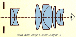 Common Telescope Eyepiece Designs By Chuck Hawks ![]() This article deals only with fixed focal length eyepieces. The top zoom eyepieces are described in detail in the article, Comparison: 8-24mm Zoom Eyepieces from Celestron, Meade, Tele Vue and Vixen. There are many different designs, or optical formulas, for oculars. Many are named for their original designer, famous opticians with last names such as Huyghens, Ramsden, Kellner, Plossl, Konig, Erfle, Branden and Nagler. Like camera lenses, inside of every ocular you will find a group or groups of individual lens elements. Oculars usually consist of two or more elements. Simple two element eyepiece designs are plagued by lateral color error (color fringing). Probably the best known two element optical formulas are the Ramsden and Huyghens, which date back to the 17th and 18th Centuries respectively. Two element oculars should be avoided. Achromatic oculars, such as the original three element Kellner design that uses a cemented, achromatic doublet eye lens, focus the long and short wavelengths of visible light, red and blue, to a common plane, but green light is not properly focused and typically creates a noticeable fringe of color around bright objects. Nevertheless, the Kellner design is much better corrected than the Ramsden or Huyghens. Similar in function to the Kellner design are the Modified Achromat (MA) and Super Modified Achromat (SMA) eyepieces from Meade. In practice, a fourth lens element is usually required to "bring it all together" and produce sharp views without intrusive lateral color and other aberrations. (All ocular designs have some residual aberrations, though.) The best eyepieces today incorporate a minimum of four elements in at least two groups in their design. Four element oculars are common and generally perform well. Orthoscopic and Plossl oculars are the most popular four element designs, while wide view Erfle type oculars use five elements. Some modern oculars incorporate more elements (up to eight) than the traditional designs for improved correction of aberrations, increased eye relief and a wider apparent field of view (AFOV). Often these eyepieces incorporate elements made of extra low dispersion (ED) glasses. The upscale Burgess/TMB Planetary (60-degree AFOV), Celestron Axiom LX (81-degree AFOV), Celestron Ultima LX (70-degree AFOV), Celestron X-Cel (55-degree AFOV), Meade Ultra Wide (84-degree AFOV), Orion Stratus (68-degree AFOV), Orion MegaView (82-degree AFOV), Tele Vue Ethos (100-degree AFOV), Tele Vue Nagler (82-degree AFOV), Tele Vue Panoptic (68-degree AFOV), Tele Vue Radian (60-degree AFOV) and Vixen Lanthanum-LVW (65-degree AFOV) ocular lines, to name a few of the better known brands, are examples of such eyepieces. These are priced higher than standard designs and they are available in a variety of focal lengths in both 1.25" and 2" size. However, more elements are not necessarily better in terms of brightness, sharpness and contrast. The more glass photons of light have to travel through on their way to your eye, the more light is absorbed, scattered and lost, decreasing brightness and contrast. Optical design is always a balancing act, an attempt to minimize flaws (aberrations and distortion) and maximize certain desirable characteristics, such as sharpness from center to edge, brightness, contrast, eye relief and a flat field. Different eyepiece designs do better in some areas than others and no design is perfect in all respects, so you have to choose the design that is most suitable for your intended purpose. The quality, care and precision of manufacture is also extremely important. Online specialty retailers, such as Optics Planet (www.opticsplanet.com), offer extensive eyepiece selections at a wide range of prices. Following, in alphabetical order, is a brief description of the most common eyepiece designs encountered today. Brandon Brandon eyepieces are manufactured by Vernonscope and sold directly, as well as by Questar. Questar supplies house brand Brandon oculars with its telescopes. Vernonscope offers 1.25" Brandon eyepieces in 8mm, 12mm, 16mm, 24mm and 32mm focal lengths. (These are pictured in the color photo at the top of this page.) The Brandon uses four elements in two groups. It is a symmetrical design similar to the Plossl with a 50-degree AFOV, but its optical properties are intended to mimic those of an Orthoscopic ocular. Brandons are sharp, flat field, highly corrected eyepieces with very low distortion and exceptionally high contrast. Like Plossls and Orthos, however, short focal length Brandons are lacking in eye relief. Interestingly, unlike other premium eyepieces, Vernonscope Brandon oculars are not multi-coated, although they are fully coated. The stated reason for this is to reduce narrow angle light scatter; multi-coatings increase narrow angle light scatter, which interferes with low contrast detail. Vernonscope has tried seven layer multi-coatings and their single layer anti-reflection coating works as well or better. Erfle Heinrich Erfle invented this design during the First World War. The basic Erfle uses five elements in three groups and delivers a wide apparent field of view of about 60-degrees. Erfle variations are also made with six elements in three groups, as in the diagram below. Erfles have a nice, flat field from edge to edge, although sharpness and contrast is slightly inferior to the Orthoscopic and Plossl designs. They also feature long eye relief, especially important for eyeglass wearers. ![]() This combination of features makes these oculars excellent for wide sky viewing of open clusters, star fields, etc. They are usually found in focal lengths in the 18mm to 32mm range. I have used 1.25" Erfles in 24mm and 32mm focal lengths, where they give a greater field of view than Plossl type oculars. Erfle type oculars make excellent medium to low magnification eyepieces and today are often sold under proprietary names that do not credit Heinrich E