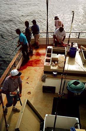 Action during a wide-open tuna bite on the 95' long range sportfisherman "Searcher" out of San Diego, California. This was a Western Outdoors Magazine sponsored trip, and all 25 passengers limited out. Photo by Chuck Hawks. |