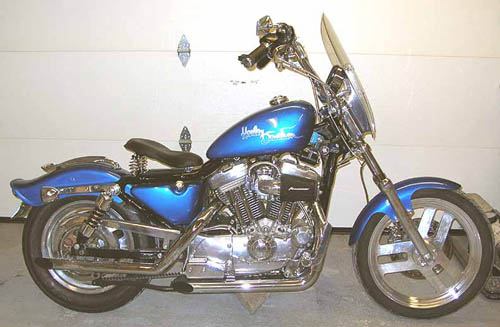 New Parts If you have new, bright steel or plastic parts, and they have no ripples or dents, and very fine sanding marks, you can simply scuff-sand with "Scotchbrite" abrasive pads (red or green) or #400 sandpaper to remove the gloss. Degrease the surfaces with a commercial degreaser or Naphtha (lighter fluid), and shoot on two or three light coats of primer, 30 minutes between coats. Sand smooth with #600 wet/dry paper, and you're ready for paint. No steel should be showing through. Imperfect Parts The above scenario is as rare as Atheists in Foxholes. My new tank appeared to have been pounded out by a drunken blacksmith with a stone axe. Scuff-sand and degrease the part. Sand any dents and loose paint down to bare steel, but you usually don't have to completely strip the original paint, if it is reasonably hard, and is not attacked by the sprayable primer (check). Harley stock paint will stop a .357 Magnum, and usually doesn't have to be removed unless it's cracked. Now, prepare for the "Bondo Experience." Bondo is damn near magical, when compared to the Hot Lead techniques that preceded it. It's a putty, about the consistency of peanut butter, which cures with the addition of a hardener (sometimes called a "Catalyst"), that comes in a separate tube. Bondo is usually gray, the hardener red or blue. A glob of Bondo the size of a golf ball needs a bead of hardener about 1/2" long at room temperature. Heat accelerates the cure and cold retards it. If it has any hardener in it at all, properly mixed, it will eventually cure. The urge to over-use hardener is almost overpowering, get extra. Mix the hardener into the Bondo on a flat, throwaway surface until the color is uniform. You should have 10-15 minutes of working time, if not, adjust the quantity of hardener in the next batch. Mix only what you need, I always seem to end up with a polyester Popsicle of excess Bondo. Fill dents until "proud" of the surface by 1/8" or so. A new, but rippled steel part must be "skim-coated" overall to a depth of about 1/16". Bondo is best applied with plastic "squeegees" available where you bought the Bondo. GO EASY with the stuff! It goes on deceptively easily, but you have to sand off any surplus! It is ALWAYS easier to put on another light coat than to sand down half an inch of pink granite. You have been warned! When the stuff starts to cure (mixed that batch a little "Hot", didn't we?), stop applying immediately, don't try to stretch it. A full cure takes about 24-48 hours, but Bondo is usually workable after 1-2. In fact, if left overnight, the stuff is too hard to work easily. You want it to just barely take an impression from a thumbnail. Work down the high spots with a Stanley "Sureform File." These look and work like a cheese grater. Regular files clog up, and wood rasps leave grooves. When you start getting close to the correct contour, switch to #80 sandpaper on a sanding block. Experiment with different blocks, from hard wood to softer rubber. A strip of 1/4" ply follows the contours of a tank well. When the contour looks right, go to #180 and #220 to get rid of the sanding marks from the heavier papers. It may take several coats of Bondo to do this. Close your eyes and run your fingers over it. You can feel irregularities that you can't see. You can use an electric sander for some of this, if it has a fairly soft rubber pad. I've had good results with a Porter Cable model 333 Random Orbit. OK, the contour looks great, but there will be small imperfections, tiny bubbles, and some scratches. Squeeze out a small amount of spot putty and put the cap back on the tube. Apply this to the imperfections with a flexible rubber squeegee, or whatever works for you. I use matchbook covers. Let it dry hard, maybe 2-3 hours, then work it down starting with #220, finishing with #400. Most of the putty applied should be sanded off, leaving only the little bit in the void or scratch. The part is perfect! Couldn't be smoother or fairer, right? Well, as Senator Moynihan used to say, "If you don't believe the World exists to break your heart, what's the point in being Irish?" Spray the piece overall with primer, then wet-sand with #600. If you don't find more irregularities, you have a real talent for this and I hate you! You can use Bondo and spot putty in very light applications over the primer, then repeat. Some people find this terribly frustrating; some find a sort of "Zen of Sanding." I'm about 50/50. You eventually find yourself with a part that shows no irregularities, even outside in sunlight, a uniform dull gray, smooth as a Vinyl Siding Salesman. It has taken some real effort to get here, but trust me, the BEST prep that you can do is just barely good enough. If you even think for a second that it needs one more pass, it does. After this, painting is duck soup, money for jam, easy as cake, piece of pie. On to the painting article, knowing the hard part is behind you. Go forth and be joyful. PS: The pic above ain't great art, but there's six inches of ice outside that door (winter 04/05). |