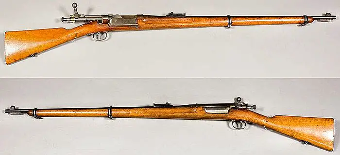The U.S. Krag-Jorgensen Rifle and Carbine By David Tong The late 19th Century was a watershed development time for the infantry rifle. The advent of smokeless powder, the jacketed bullet and the turn bolt repeating rifle created a mad rush to adopt all three technologies to take advantage of the improvements in accuracy, long range trajectory and the reduction of tell-tale smoke. (The "haze of battle" was very real in the black powder era.) One of these nations was Norway. Captain Ole Krag of the Norwegian Army headed the government arsenal and Erik Jorgensen, a gunsmith, together developed a cartridge magazine unlike any other. Originally, it was designed to hold ten rounds of ammunition in a semi-circle around the receiver of a rifle, in order to not have a feed device protruding from the bottom of the action. Although it was thought this magazine could be used on any action, it was considered too bulky. A prototype rifle was sent to Denmark and they concluded something less bulky was needed, so a five round magazine was created. This magazine was then incorporated into a new rifle action. Like some other early bolt actions, the rear receiver bridge was split to allow passage of the rifle�s bolt handle when the bolt was removed. This new Krag-Jorgensen action's magazine protruded from the right side of the rifle. It had a spring loaded box with a machined tab on its top and a hinge on its bottom. The shooter's right thumb is used to open the door. Rounds can then be put into the open internal magazine without regard how the rims are placed, as long as the bulleted end is pointed forward (toward the muzzle of the rifle). In addition, the action incorporated a magazine cut off that allowed it to be used as a single shot. Taken together, these two innovations reflected military thinking that the conservation of ammunition during battle was highly preferable and encouraged the slowing of fire by troops for greater accuracy. The Danes adopted the new Krag-Jorgensen rifle in 1889. Its major difference was that they modified the magazine door box by hinging it at its front, instead of at its bottom, so loading it meant pivoting the door forward, rather than downward. ![]() The U.S. Army held trials in New York in 1892 to select a new infantry rifle to replace the single shot 1873 "Trapdoor" Springfield. There were some 53 rifles submitted, although the finalists were all European rifles, including the Lee, Mauser and Krag-Jorgensen. After prevailing in the trials, the Krag was selected in mid-1893. Army Ordnance Board personnel liked the idea of mechanically slowing the rate of fire and consumption of ammunition, considering it an advantage. The prevailing thought was that soldiers should be trained to fire their new repeating rifles as they did their single shots, manually loading the chamber by hand for each shot, rather than by cycling the bolt. The magazine should be held in reserve for contingencies.There were about a half-million Krag-Jorgensen rifles and carbines built under license by the U.S. Government's Springfield Armory, in four major sub-types, between 1894 and 1904. These are the M1892, M1896, M1898 (most prevalent) and the M1899. These were built both in rifle and cavalry carbine models; the latter being substantially shorter and lighter, at the price of increased recoil. Rifles had 30� barrels and weighed about 9.25 pounds, while carbines carried a 22� tube and were about 1.5 pounds lighter. Norway, Denmark and the U.S. were the only nations to adopt the Krag, although it was a very well finished and smooth operating rifle. The American Krag bolt locks with a single lug, although the root of the bolt handle functions as a safety lug. In addition to its side loading magazine, another of the several peculiarities of the action was a long, top mounted extractor. Hinged with a rivet at the rear of the bolt body, it must be swiveled to the right and lifted up, off of the bolt, as the bolt is withdrawn to remove the bolt from the receiver. ![]() Mauser introduced their �Spanish� Model of 1893 and that rifle made use of a stripper clip for the first time. This proved to be unfortunate for the United States when it found itself embroiled in the Spanish-American War in 1898. Clip fed Mausers easily provided higher rates of fire than the Krag rifles used by American troops, giving the Spanish a tactical advantage and markedly increasing the number of American casualties. The rapid adoption of clip or charger loaded magazines to the infantry rifles of all other major powers meant that the Krag-Jorgensen quickly became obsolescent. As a result, the Krag was short lived in American service. It was officially replaced after only ten years by the 1903 Springfield rifle and completely phased out of use by the regular Army by 1907. Krag rifles were used by American troops during the Spanish-American War (1898), Philippine Insurrection (1899-1902) and Boxer Rebellion in China (1899-1901). In addition, several Engineer companies carried Krags into the Great War (WW I) in 1917. The cartridge used by the American Krag-Jorgensen rifle was known officially as the �.30 U.S. Government� and much more widely by its civilian designation, the .30-40 Krag. (A .30 caliber bullet powered by 40 grains of the then new smokeless powder.) It is a rimmed, bottleneck design with considerable body taper for easy and reliable extraction, rather similar in appearance to its historical contemporary the .303 British. (The modern ballistics of the two cartridges as factory loaded in the U.S. are nearly identical.) Due to the early metallurgy and single heat treatment (case hardening) of the action, the .30-40 cartridge operated at the relatively low maximum average pressure (MAP) of about 40,000 psi. It drove a 220 grain round nosed bullet at a leisurely muzzle velocity (MV) of 1,970 fps. with a muzzle energy (ME) of 1724 ft. lbs. from the Krag carbine and only slightly faster (2000 fps) from the long ba