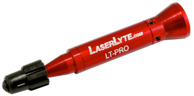 LASERLYTE Laser Trainer Pro (LT-Pro) By Chuck Hawks ![]() This nifty training device from LaserLyte installs into the muzzle of your handgun and fits tight using a patented plastic arbor and taper system. When installed, the red anodized aluminum body of the LT-Pro extends only about �" from the end of the barrel, so it is nearly a flush fit. This allows realistic training, including the use of nearly any type of holster. The mounting system firmly retains the LT-Pro in the handgun's barrel during practice and it works with two-inch or longer barrels in calibers .35 to .45. A sound activated switch inside the LT-Pro causes a red laser dot to be projected for 100 milli-seconds from the muzzle when the gun's hammer or striker falls. Powered by three #337 hearing aid type batteries (included), the LT-Pro is good for approximately 3000 shots before battery replacement is required. Here are the specifications and features: