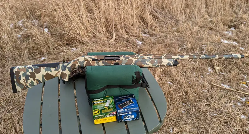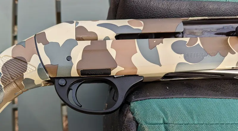 It is unclear to me if Breda currently has a manufacturing facility of their own: I've never so much as seen a picture of it, if it currently exists. Breda, maker of machine guns for WWII, was at one time ahead of their time. Breda had 3 inch magnum 12 gauge and 20 gauge long recoil models before Browning did. The Breda long recoil shotguns were not only well made, but they featured a two piece receiver, tool-less disassembly, and interchangeable chokes. All of this was available in the 1950s, long before anyone else. Breda has also been through several buyouts and has had relationships with several other gun manufacturers. I owned a Beretta 303 20 gauge that had a Breda receiver. I've been told that Beretta-Benelli makes the barrels for Breda currently, but personally I don't know either way. This Sauer SL5 Waterfowl Fred Bear Camo 26 inch barrel model is clearly a duck and goose gun, for it weighs in at a hefty 7 lbs. 13 oz. The trigger is on the heavy side, breaking at 5.5 pounds, but it isn't as problematic on this shotgun as it would be on a lighter shotgun. The SL5 come with five extended choke tubes and is generally very well finished. The only blemish I found was a rough patch of camo film on the bottom of the barrel, which is covered by the forearm when the gun is assembled. It isn't a deal-breaker, but I expected better.