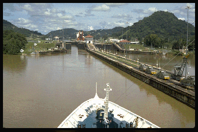 Island Princess, Trans-Canal cruise, 1984: Approaching Pedro Miguel Locks, Panama Canal, Panama. |