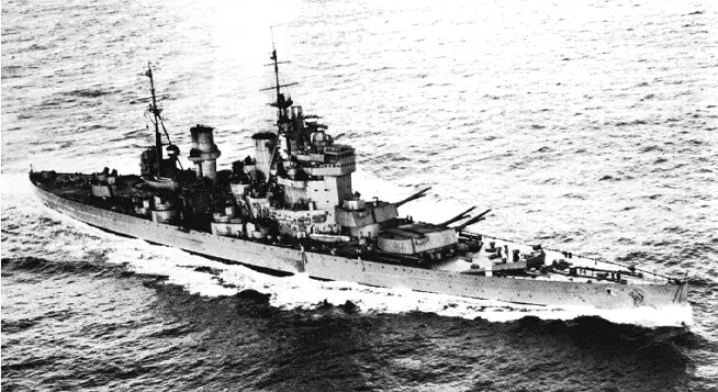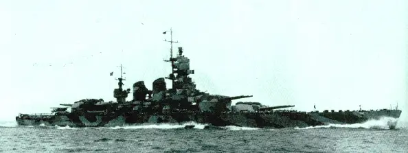 Scharnhorst was commissioned on 7 Jan 1939; Gneisenau on 21 May 1938. During the winter of 1938-39, both were equipped with the "Atlantic" bow, which increased their overall length to 770 feet 8 inches. The second catapult, on top of the aft 11 inch turret, was removed from both ships at about the same time and Scharnhorst was equipped with a tripod mainmast. As with other WW II capital ships, AA armament was increased as a result of wartime experience. Scharnhorst received 24 additional 20mm light AA guns and Gneisenau 12 more. Scharnhorst was fitted with six 21 inch torpedo tubes (3x3) removed from the light cruiser Nurnberg. During the first half of the war, the two ships spent most of their time together and they had quite successful war records. Scharnhorst became the most active and successful of the German battleships. In November 1939 they sailed into the North Sea, attempting to break out into the Atlantic. Instead, they encountered the British Armed Merchant Cruiser Rawalpindi, on distant blockade patrol, which they sank. On 9 April 1940, while covering the German invasion of Norway, Scharnhorst and Gneisenau exchanged gunfire with the British battlecruiser Renown. Scharnhorst was hit by Renown's 15 inch guns and the pair withdrew at high speed, rather than fight it out with the old British battlecruiser. Later in the same operation they sank a tanker and an empty troopship, then fell upon the British aircraft carrier Glorious and escorting destroyers Ardent and Acasta. The German battleships sank all three British warships, although one of the destroyers put a torpedo into Scharnhorst, flooding her with 2,500 tons of water. This likely saved a nearby convoy, as the Germans were forced to retire to have the torpedo damage repaired. After repairs, Scharnhorst and Gneisenau broke out into the Atlantic and sank 22 ships between 22 Jan and 23 Mar 1941, when they put in at Brest on the occupied Atlantic coast of France. Both ships were frequently bombed by the RAF while at Brest and after the loss of the Bismarck, which had hoped to join them there, plans were made to bring them home to Germany. 11-13 February 1942, the famous "Channel Dash." S and G, along with heavy cruiser Prinz Eugen (survivor of the Bismarck debacle), ran from Brest, through the Straits of Dover, to safety in Kiel. Scharnhorst and Gneisenau both hit mines off the coast of Holland during the passage. Both went into dry-dock at Kiel for repair, where a few days later Gneisenau was hit by British bombers and her whole forecastle was blown off. It was at this time that the plan to go ahead and convert her to 15 inch guns was put into effect, but this conversion was never completed. Late in the war the hulk was sunk as a block ship in Gdynia harbor. Scharnhorst was repaired by October 1942 and in March 1943 she was sent to Norway. From there she, in company with battleship Tirpitz, bombarded the Norwegian weather station on Spitsbergen Island. I have been to Spitsbergen Island, which is very far north in the Arctic Ocean, and it is hard to imagine anything of sufficient military value there to warrant the attention of two battleships. Just surviving against the elements is difficult enough in that cold and lonely place, which is frozen within the Arctic ice pack during the winter. Scharnhorst's last operation was against a convoy en route to Murmansk, Russia. On 26 December 1943, Scharnhorst fought the Battle of North Cape. This famous incident, the last battleship duel of the European war, was precipitated when the Scharnhorst and five destroyers attempted to interdict convoy JW 55B in vile weather off the North Cape of Norway. The situation on the Eastern front had worsened to the point that the German High Command was willing to give the naval force commander on the scene, Rear-Admiral Erich Bey, tactical freedom for the first and only time in the entire war. It is striking that the weather conditions were very similar to the New Year's Eve Battle of the previous year, only worse. (As an aside, I might mention that when I visited the North Cape in the middle of July, it was cold with a light rain and a heavy fog that cut visibility to a few yards. There is a small plaque there commemorating Scharnhorst's last battle). In the New Year's Eve Battle, the heavy cruiser Hipper, pocket battlecruiser Lutzow and six destroyers, failed to destroy a convoy bound for Murmansk. They were driven off, in conditions of near zero visibility, by the British escort under the command of Robert Burnett, consisting of light cruisers Jamaica and Sheffield with five destroyers. British superiority in radar and tactics had more than compensated for the German ships' superiority in heavy guns. Now, a year later, the disparity between British and German radar had only worsened. Scharnhorst and her five destroyers put to sea from Alten Fjord on Christmas Day. The next morning (the 26th), Admiral Bey deployed his destroyers in a scout line on a south-westerly course, while Scharnhorst continued on to the north. The German force was divided. You would think that after four years of war German Admirals would have learned not to divide their numerically inferior forces, but apparently not. As Scharnhorst blundered around in the fog and snow, plunging into heavy seas, she was suddenly engaged by the British heavy cruiser Norfolk and the light cruiser Belfast. The light cruiser Sheffield trailed the other two, but could not get within gun range. This cruiser force was again commanded by Vice-Admiral Robert Burnett, hero of the battle against Hipper and Lutzow the year before. Almost immediately an eight inch shell knocked out Scharnhorst's forward radar. She was left almost blind in the prevailing conditions of very poor visibility. She maneuvered to escape the British cruisers, succeeded, then turned back to her northerly course to again seek the elusive convoy. Admiral Bey tried to summon his destroyers, but by then they were far away and unab