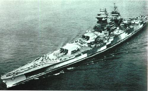 Both ships were laid down on 28 December 1922. Nelson was completed in August 1927 and Rodney in November 1927. The principle change during their lifetime was the wartime increase in light AA guns and the addition of radar. For example, Nelson had six octuple 2pdr pompom, four quadruple 40mm Bofors and 60 to 70 20mm Oerlikon light AA guns by the end of the war. As with all wartime battleships, displacement crept upward as new equipment was fitted, increasing by two to three thousand tons by 1945. Both survived WW II and were broken up in 1948. Both had active war careers. Nelson was mined twice and torpedoed once. The highlight of Rodney's career was undoubtedly when she successfully fought Bismarck. This famous action, in which battleships King George V (Admiral Tovey's flagship) and Rodney finally confronted the long suffering and damaged Bismarck, has been recounted many times. There is no need to go into it again here, except to point out that while Bismarck had been torpedoed in the stern and her rudders jammed, her fighting potential was undiminished. In the final engagement KG V, being the flagship, is most often mentioned. However, my research leads me to believe that it was actually Rodney that was primarily responsible for the defeat of Bismarck. The 1922 treaty battleship quickly overwhelmed the 41,700 ton pride of the Kreigsmarine with her accurate 16 inch gunfire, pounding her into flaming junk (with some help from KG V). Bismarck never hit Rodney at all. By the end of the battle, Rodney had closed the range to the point she was able to fire two torpedoes at Bismarck, as mentioned above. One appeared to hit, but had no appreciable effect on Bismarck. There is no way a slow (22 knots at the time she engaged Bismarck) second generation battleship like Rodney should have been able to catch, let alone out shoot, a new third generation battleship approximately 1/3 larger than herself. Yet it happened and Rodney proved that once she got an adversary within range of her guns, her odd design was quite satisfactory. LITTORIO class ![]() Umberto Pugliese was the Italian director of design in 1930 when work started on the four ships of the Littorio class. They were to be the first large battleships laid down since the Nelson class of 1922 and the first Italian capital ships since WW I. Littorio and Vittorio Veneto were laid down on 28 October 1934. The third ship, Impero, was laid down on 14 May 1938 and the final ship, Roma, on 18 September 1938. In keeping with Italian tradition, they featured many innovations. Perhaps the most notable were their unusual "Pugliese" underwater protection system and their high velocity guns. They were also the first full size fast battleships, being intended as a response to the 29.5 knot French Dunkerque class battlecruisers laid down in 1932. Although nominally 35,000 tons, by the time the design was complete and the first pair was laid down in 1934, the true displacement had grown to over 40,000 tons. The Fascist government of Benito Mussolini clearly had no more respect for its treaty commitments than other totalitarian dictatorships, before or since. These ships were designed to carry nine 15 inch guns (3x3), even though the London Treaty allowed 16 inch guns. The choice of caliber was determined by the limitations of Italian ordinance manufacturing capabilities. Instead, they built an innovative, high velocity 50 caliber gun which fired a 885kg (1,947 pound) AP shell at 2,800fps, generating very high energy. The maximum range was 46,800 yards at 35 degrees elevation. Unfortunately, the barrel life was unusually short. Broadside weight amounted to 17,523 pounds. Magazine stowage was only 74 rounds per gun. The layout of these ships was conventional, with two triple turrets forward and one aft. The aft triple turret was in the "X" position, raised on its barbette to the same height as the forward super-firing "B" turret, which was unusual. I have never heard the official explanation for this. Could it have had to do with increasing space below the aft magazine for anti-torpedo protection? Ordinarily, designers try to keep the great weight of main battery turrets and barbettes as low as practical, both to improve stability and save the weight required by the very heavy armor on barbettes. A tower superstructure and twin stacks gave the ships a powerful appearance. The quarterdeck was cut away and a catapult for seaplanes installed there. The unconventional Pugliese underwater protection system consisted of a 40mm torpedo bulkhead that curved up from the outer bottom and then extended outboard to meet the lower edge of the armor belt. Within the space thus created between the void double bottom and this torpedo bulkhead was a liquid filled compartment. Within that was a void longitudinal drum with a diameter of 380cm with 6mm walls. The idea was that the explosion of a torpedo warhead would collapse the void drum within the liquid filled compartment, thus absorbing most of the explosive energy. The torpedo bulkhead was supposed to catch splinters and prevent further damage. This system was also adopted by the Russians for their Sovyetskiy Soyuz class super battleships. (See The Battleships That Never Were for a description of these ships.) Unfortunately, like most anti-torpedo systems, it did not work as well in practice as it did in theory. These were fast ships, but not as fast as they were sometimes credited with being. They did not sacrifice armor for speed, they simply exceeded the treaty limit on displacement by a wide margin, so that they could have both. On trials, Littorio made 31.3 knots at 41,122t. Their sustained sea speed was closer to 28 knots. They were designed with bulbous bows, but were troubled by vibration and the bow was consequently modified and lengthened by six feet. The second pair were further lengthened and the sheer at the bow increased. Littorio's specifications follow: