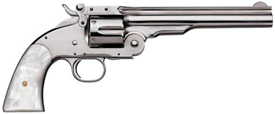 Uberti .38 Special 1875 No. 3 Top Break 2nd Model Schofield Revolver By the Guns and Shooting Online Staff ![]() This is the third in our series of Uberti 1875 Schofield revolver reviews. We have previously reviewed a blued .45 Colt with a seven inch barrel and a blued .44-40 with a five inch barrel. (See the [http://www.chuckhawks.com/index2f.gun_test.htm] Product Reviews index page.) This time, we wanted to examine Uberti's nickel finish and try the third caliber available, .38 Special. The folks at Uberti (www.uberti.com) kindly shipped us a .38, bright nickel, 2nd Model No. 3 Top Break with a seven inch barrel for review. (We initially requested a 5" barrel, but none were in stock in the US.) This revolver is supplied with beautiful pearl style grips that match the bright finish of the revolver and would delight any Old West riverboat gambler. Until the advent of stainless steel revolvers, full nickel plating was the best protection available for working revolvers. It cost more than the usual blue finish and was highly prized on the frontier, especially by those working near the water. Of course, nickel plating is also decorative and it was often chosen for high grade, engraved guns. The .38 Special is a lengthened, more powerful version of the obsolete .38 Long Colt cartridge. The .38 Long Colt is the cartridge that was chambered in the U.S. Army's then new double-action Colt service revolver and credited with failing to stop Morro warriors during the Philippine Insurrection, 1899-1913. The temporary fix was to re-issue Colt Single Action Army revolvers chambered for the .45 Long Colt cartridge. The long term solution was the .38 Special. Any .38 Special revolver can also chamber and fire the shorter .38 Long Colt cartridge, just as later .357 Magnum revolvers can also shoot .38 Special cartridges (but not the reverse!). Interestingly, this Uberti Schofield replica is marked on the barrel: ".38 Colt & S&W Spec." We checked the cylinder with both types of ammunition, which fit with no problem. Fortunately, it would not chamber .357 Magnum cartridges, a very good thing as the .357 develops over twice the pressure of the .38 Special and would almost certainly blow open a Schofield revolver. Smith & Wesson's top-break single action revolver was produced in several versions during its 30 year production life (1868-1898). In 1871, Czarist Russia adopted the S&W top-break as their service pistol, the Imperial Russian Army ordering 41,000 "Russian Model" revolvers in .44 Russian caliber. This resulted, for a time, in the bulk of Smith & Wesson's No. 3 production being sent to Russia. However, they were also sold domestically. Perhaps the most famous of the S&W No. 3 models was the version redesigned by Major George Schofield (U.S. Army Cavalry). The Schofield revision was produced by Smith & Wesson as the 1875 No. 3 revolver, more simply known as the "S&W Schofield." Major Schofield's most significant improvement to the No. 3 revolver was a frame mounted, spring loaded, stirrup-type latch (replacing S&W's original barrel mounted latch). This used heat treated parts that could be replaced in the event of excessive wear. The standard barrel length was seven inches, but many Schofields sold by civilian distributors had five inch barrels. Hence, Uberti replicas are available with both barrel lengths. There were actually two Schofield model versions, the First Model and Second Model. The Second Model can be identified by a slight round bulge on both sides, near the top, of the frame mounted stirrup latch. Perhaps these were intended to allow a better grip for the thumb and index finger of the weak (non-shooting) hand, if it was used to open the action. A dished area at the top of the stirrup, just behind the rear sight, allows opening the action with the thumb of the strong (shooting) hand. The final version of the No. 3 emerged in 1877, when all previous No. 3 models (American, Russian, Schofield, etc.) were discontinued in favor of the "New Model No. 3," which incorporated the Schofield improvements. Schofield revolvers received considerable use in the American West. Perhaps the most famous, or notorious, westerner known to favor the Schofield was the outlaw Billy the Kid. However, many other famous frontiersmen, on both sides of the law, carried Schofield revolves at one time or another during their careers. Like any single action revolver, the Schofield's hammer must be manually cocked before the weapon can be fired. That is about its only similarity to the more popular Colt, Remington and Ruger single action revolvers. There is no side loading gate or external ejector rod housing on a Schofield. Instead, S&W's single action is a top break design. The Schofield's curved rear frame is longer than a Colt SAA and its smooth grip is shaped differently. There are three hammer positions: down, quarter cock and full cock. The quarter cock position permits the cylinder to rotate freely and allows opening the action for loading or unloading. To open a Schofield revolver, bring the hammer to the quarter cock position and then pull back the cylinder latch, which also incorporates the rear sight notch. This unlocks the action and allows the barrel/cylinder assembly to swing downward. A star extractor raises the cartridge cases as the action is opened. Invert the pistol as it is opened to allow the cases to drop free (there is no ejector). When the barrel assembly reaches its fully open position, the extractor snaps back into place and fresh cartridges can then be loaded into the cylinder. Take care to ensure that all fired cases drop clear of the cylinder before the barrel/cylinder assembly reaches the end of its rotation and the extractor snaps closed. If a case remains in the chamber when the barrel/cylinder assembly hits its stop, it can prevent the extractor star from retracting completely, preventing the pistol from being closed. If you briskly swing the revolver open with a snap of the wrist, all 