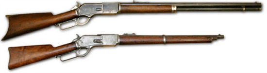 A Brief Winchester Lever Action Rifle Chronology and History By Chuck Hawks This brief introduction to the subject covers Winchester lever action rifles from the New Haven Arms Henry rifle to current Winchester (Herstal Group) production centerfire rifles. It is certainly not a definitive history, as that would require a very large tome and such books have already been written by people more knowledgeable than I. To provide a bit of back story, in 1855 the little known Volcanic Arms Co. moved to New Haven, Connecticut. Volcanic was owned by three partners, financier Courtlandt Palmer, Horace Smith and Daniel Wesson. Volcanic manufactured lever action repeating pistols, and a few rifles based on the same action, for primitive self contained cartridges. Although patented by Smith and Wesson, the Volcanic lever action was actually designed by Horace Smith and a brilliant firearms designer named Benjamin Tyler Henry. That same year, Oliver Winchester became a director of Volcanic, providing capital to keep the struggling Company afloat. At this time, Oliver Winchester was successfully manufacturing mens' shirts of an improved type in Hew Haven and had become a wealthy businessman with sufficient capital to branch out into other fields of interest. Long story short, the Volcanic pistols were not commercially successful, the Company went into receivership early in 1857 and Winchester wound up owning all of the Company's remaining assets. Winchester reorganized the Company under the name New Haven Arms and B. Tyler Henry became the plant manager and chief designer, a position that had been held by Horace Wesson at Volcanic Arms. This was a time of flux in the arms industry, as designers in both North America and Europe were experimenting with self contained cartridges and breech loading actions that would soon largely replace the muzzleloading firearms that had dominated arms design for centuries. The cartridges used in Volcanic pistols were unreliable and under powered, so by 1858 B. Tyler Henry was designing and experimenting with a big bore (.44 caliber) rimfire cartridge that became the .44 Henry. At the same time, Henry was redesigning and improving the New Haven Arms lever action. The result was the famous 1860 Henry rifle, chambered for the .44 Henry rimfire cartridge, which hit the commercial market in 1862. Model 1860 Henry Rifle ![]() The Henry rifle never bore the Winchester name, as it was produced during the New Haven Arms years, before the Company name was changed to Winchester Repeating Arms. However, it featured the toggle-link lever action used, with little change, in all subsequent Winchester rifles for the next 16 years. The Henry rifle's design included a brass frame (a few iron frame Henry's were built), full length magazine mounted beneath an octagon barrel, exposed hammer and a top ejection receiver. The Henry action is a controlled feed design and it can be operated on its side or upside down with complete feeding reliability. This was not a strong action by modern standards, as the rimfire cartridge for which it was designed did not operate at high pressure and a brass receiver is not as strong as a steel receiver. However, it was a high capacity, fast, reliable and exceptionally smooth action; clearly the most advanced rifle of its time. The magazine, which was integral with the barrel, was loaded from near the rifle's muzzle end and the magazine follower had an external tab that extended from a slot in the bottom of the magazine tube. This tab allowed the shooter to manually compress the magazine spring, so the rifle can be loaded. Although fancy and engraved Volcanic guns had been made, the Henry rifle marked the real beginning of what became a long Winchester tradition of building high grade rifles with fancy walnut stocks, plated receivers, engravings and inlays of all sorts to special order. (After 1873, fancy stock carving and checkering patterns also became available.) Before the Henry rifle was replaced by the Winchester Model 1866, a total of 14,094 Henry rifles had been produced. Today, an accurate reproduction of the Original Henry Rifle is produced by the modern Henry Repeating Arms Company. The only significant change is the use of a modern (stronger) brass alloy receiver. The new Original Henry Rifle is chambered for the .44-40 centerfire cartridge, as production of the .44 Henry rimfire cartridge was discontinued long ago. Model 1866 ![]() 1866 brought major changes. Nelson King succeeded B. Tyler Henry as the plant superintendent by the beginning of the year. In May, the Company's name was changed to Winchester Repeating Arms Company. An improved version of the Henry rifle was introduced, becoming the first rifle to wear the Winchester name. The Winchester Model 1866 was initially referred to as the "Improved Henry." One major improvement was the addition of a wooden fore arm. (The original Henry rifle had no fore arm; the shooter simply held onto the magazine tube.) Another was the incorporation of a spring-loaded loading gate in the right side of the receiver through which cartridges were fed into the magazine. The magazine became a closed tube, separate from the barrel, that no longer needed a slot in the bottom for a magazine follower. This design improvement was the creation of and patented by Nelson King and it is still used in most lever action rifles today. The Model 1866 fired the same Henry .44 rimfire cartridge used in the Henry 1860 rifle. B. Tyler Henry's toggle link lever action remained, as did the brass receiver, which is why the Model 1866 was also called the "Yellow Boy." Initially an octagon barrel was standard, although later round barrels were offered in both rifle and carbine versions. Although superseded by the Model 1873 and subsequent Winchester models, the Model 1866 was sufficiently popular to remain in the Winchester line through 1898, with the total production being 170,100 rifles. In modern times, as the relevant patents ha